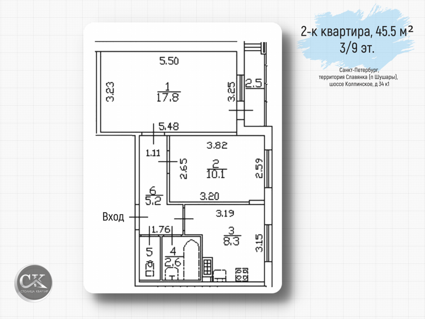 • Общая площадь: 45.5 м²