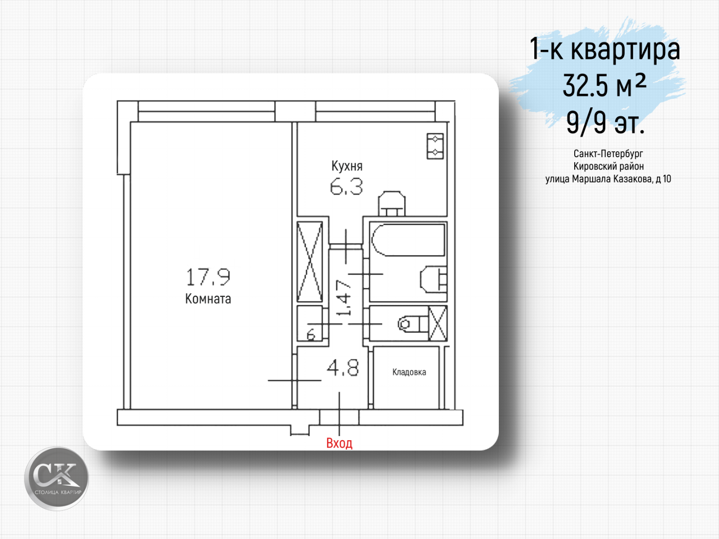 • Общая площадь: 32.5 м²