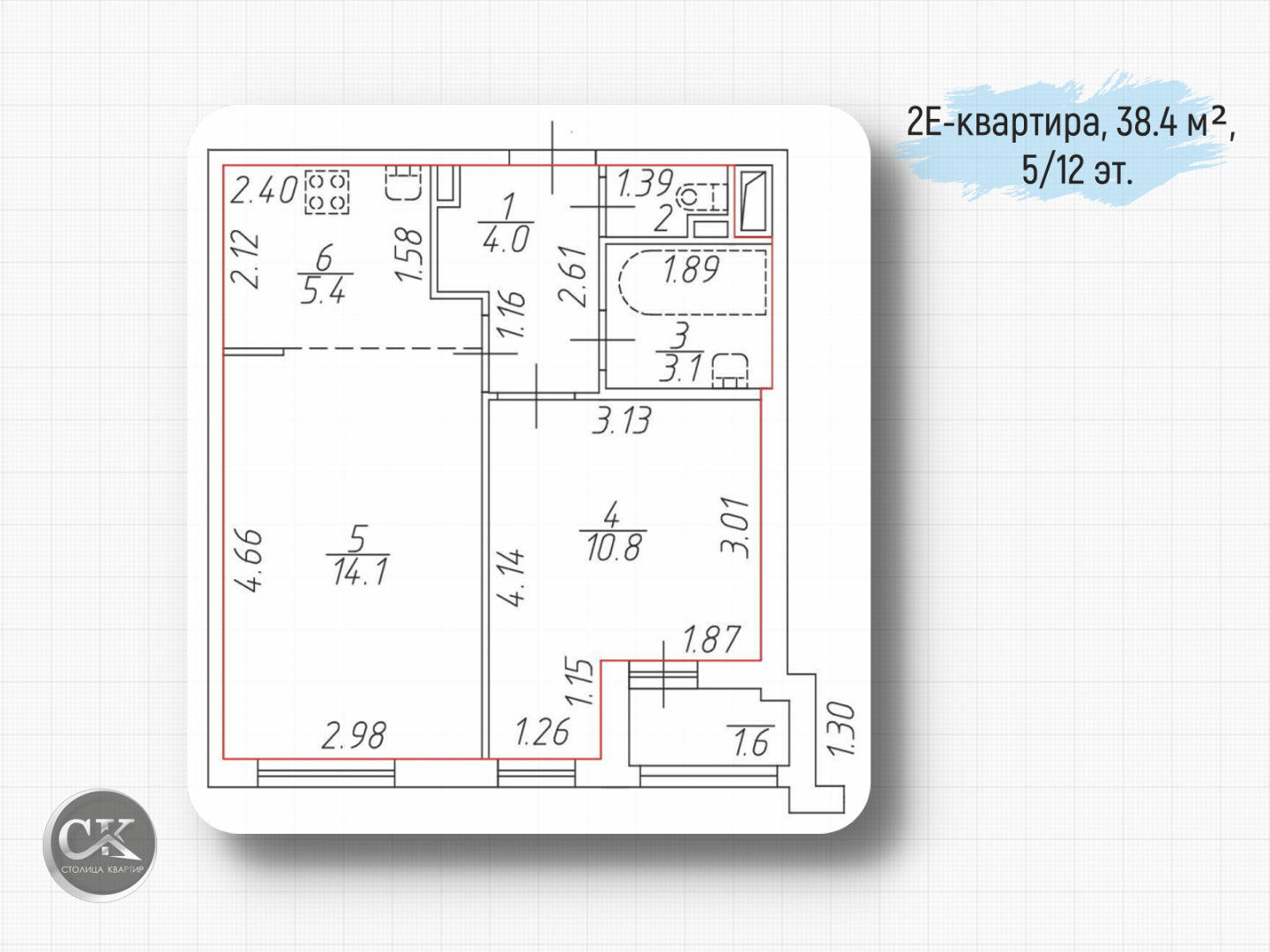 Площадь: 38.4 м² (просторные комнаты: 10.8 и 14.1м²)