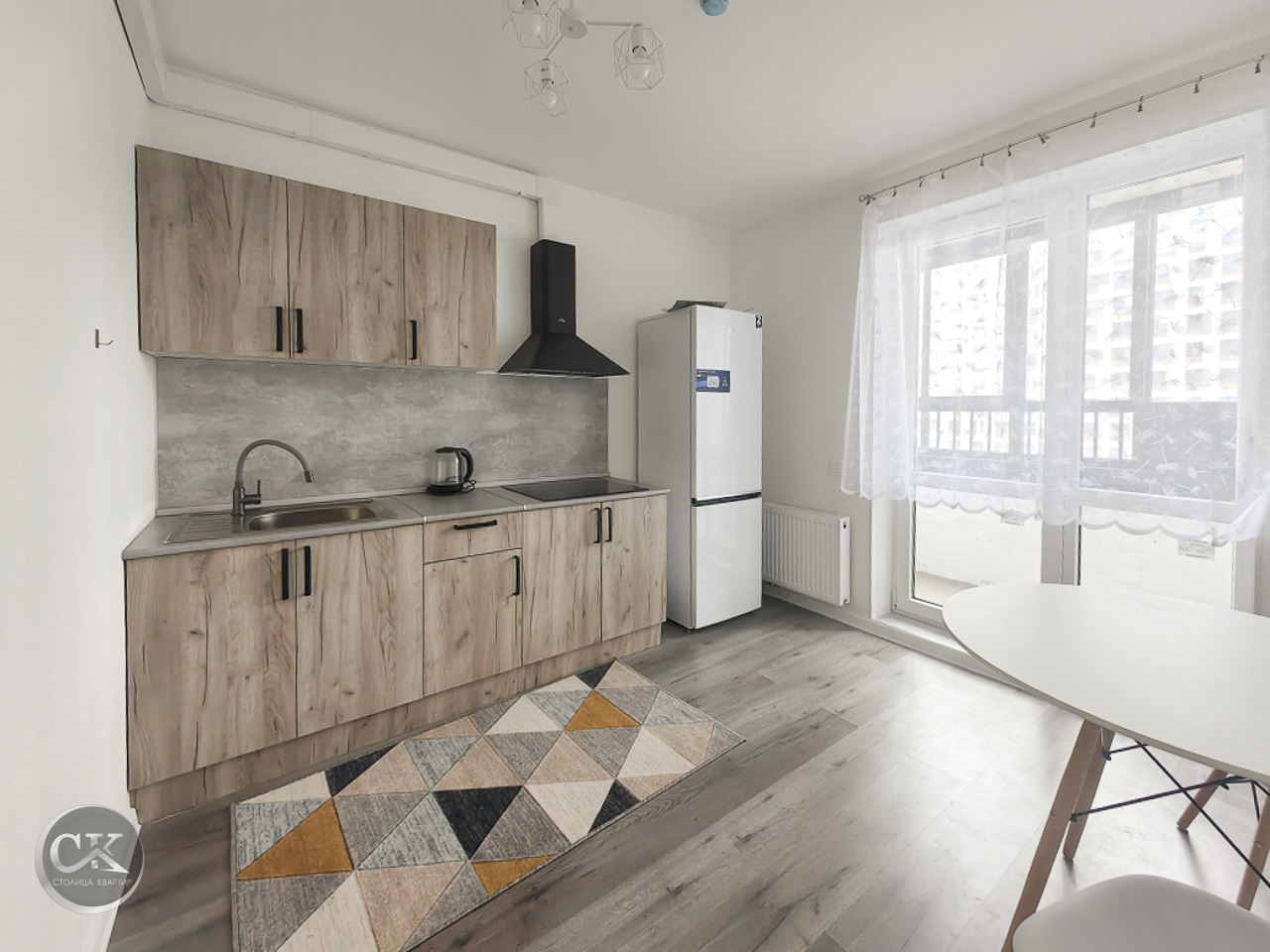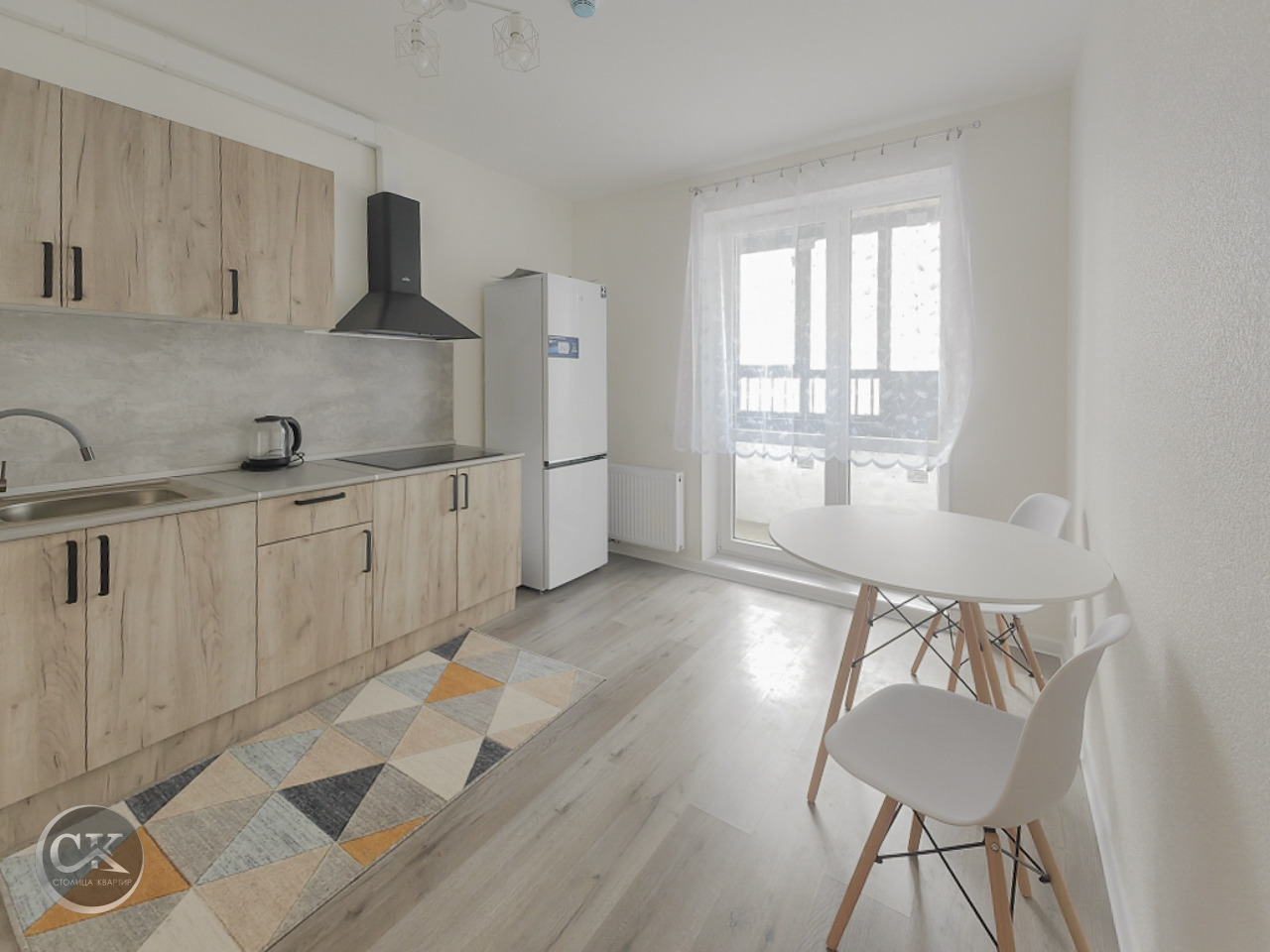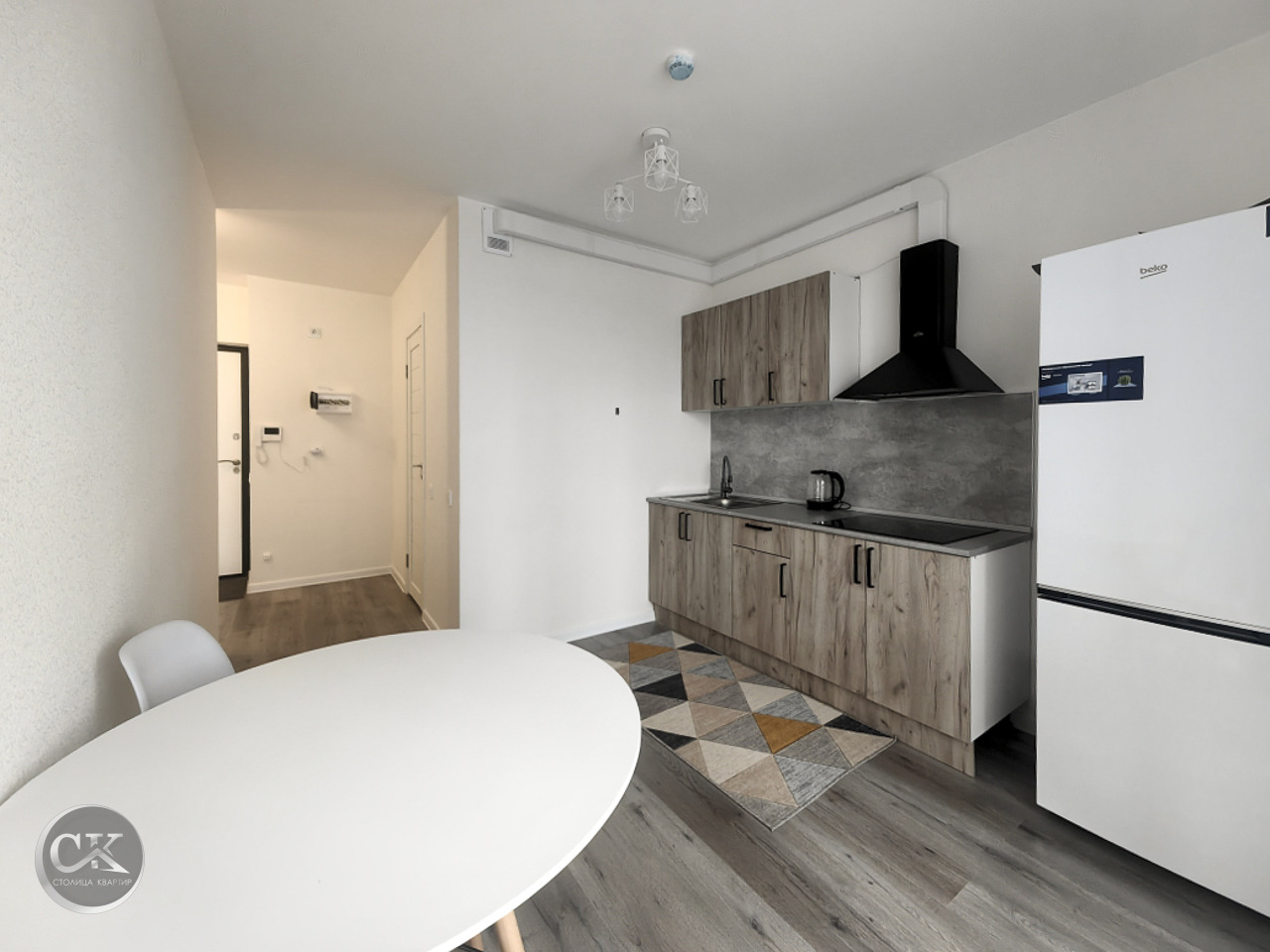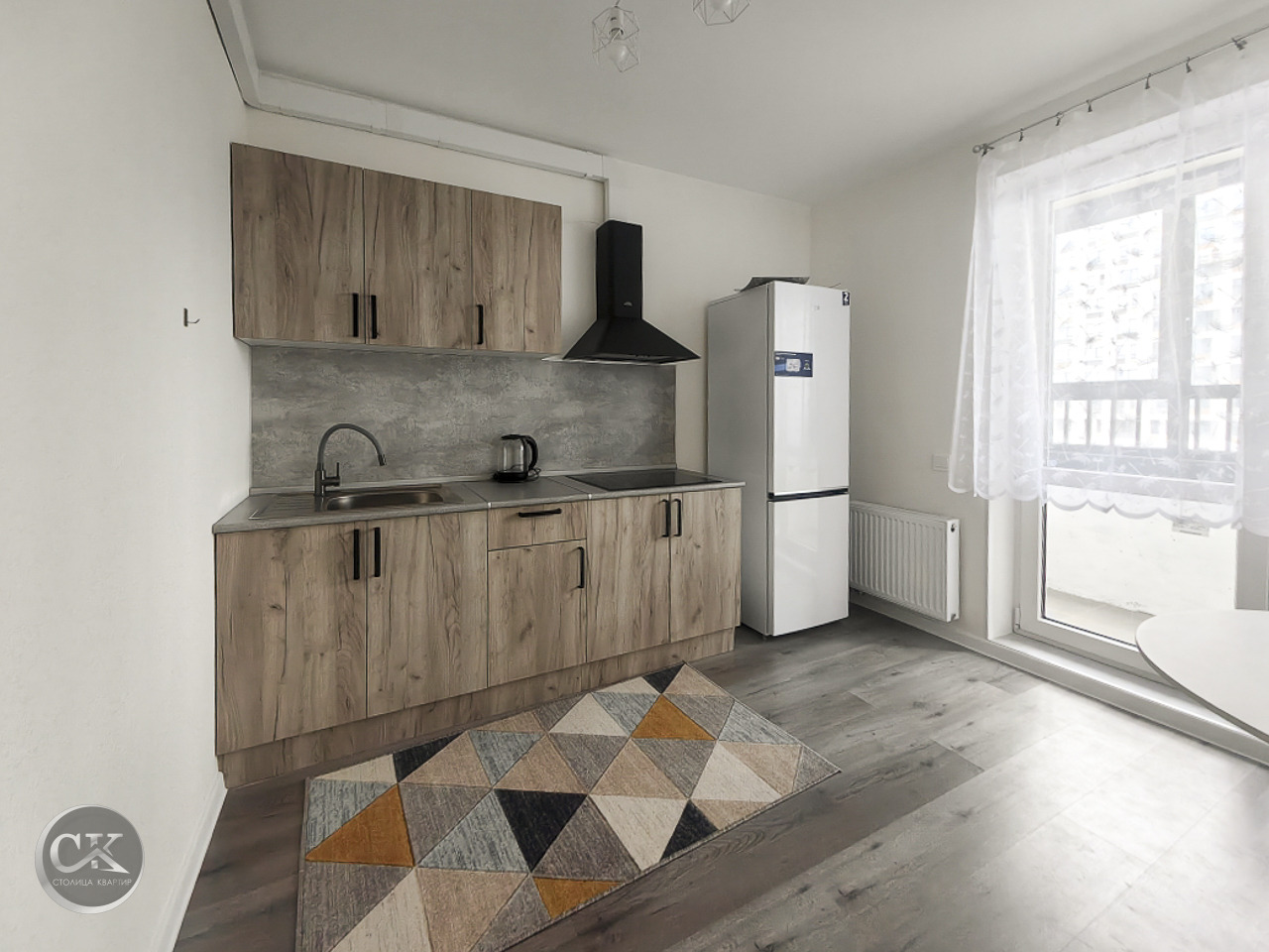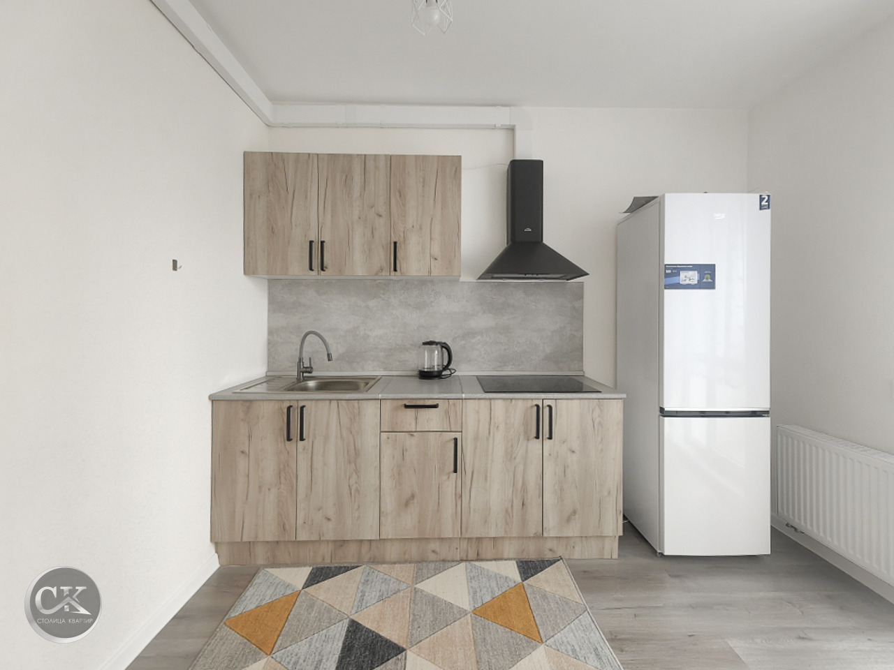 - полностью оборудованная кухня: холодильник, варочная панель, вытяжка, электрический чайник.