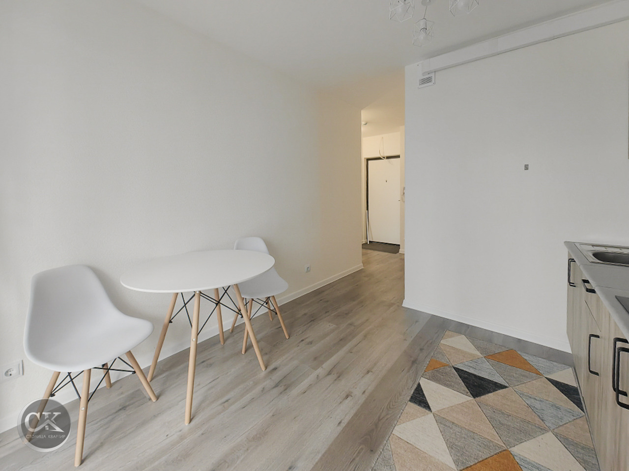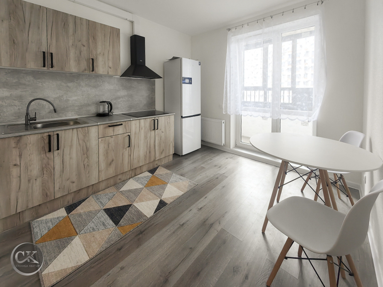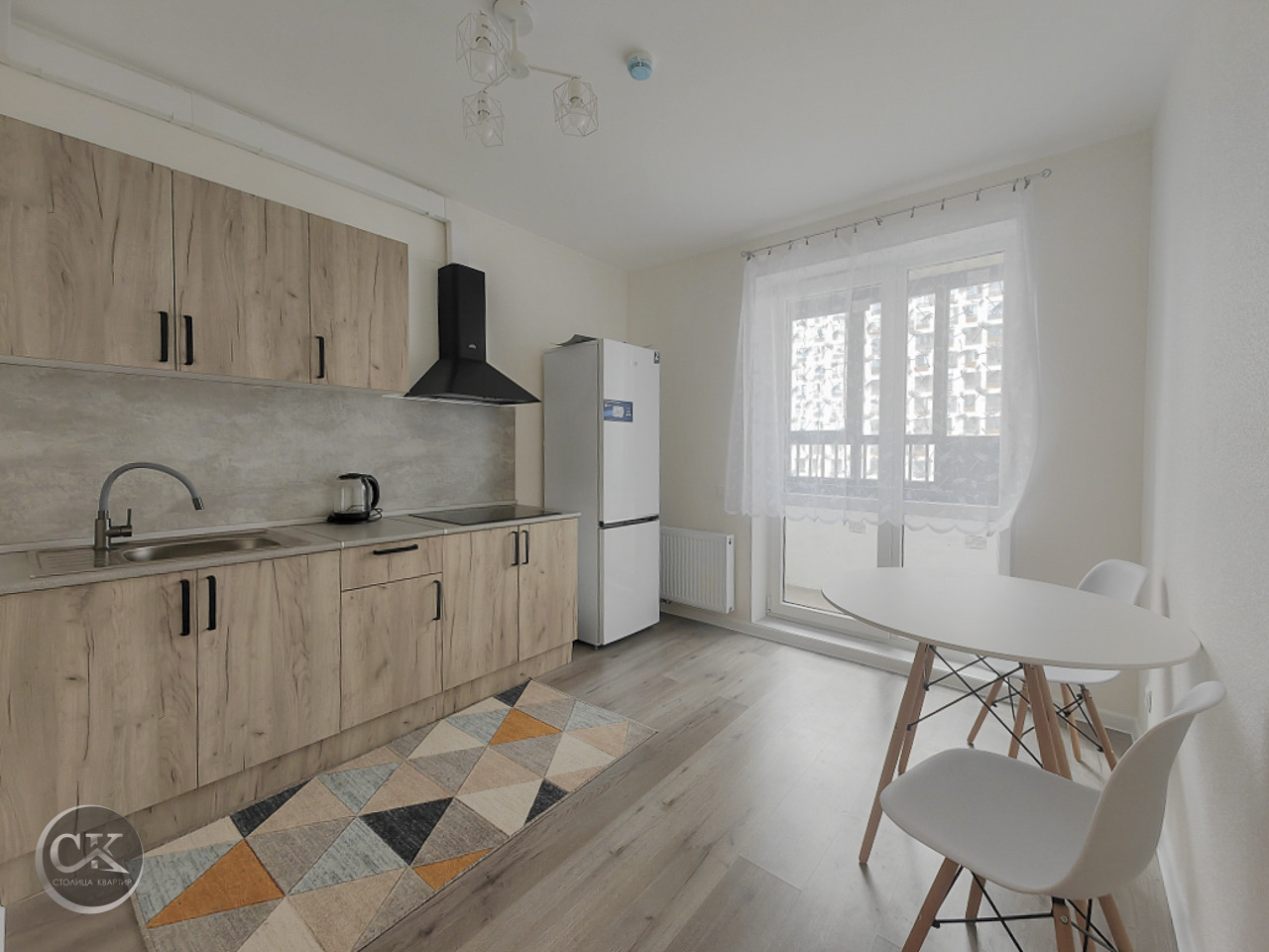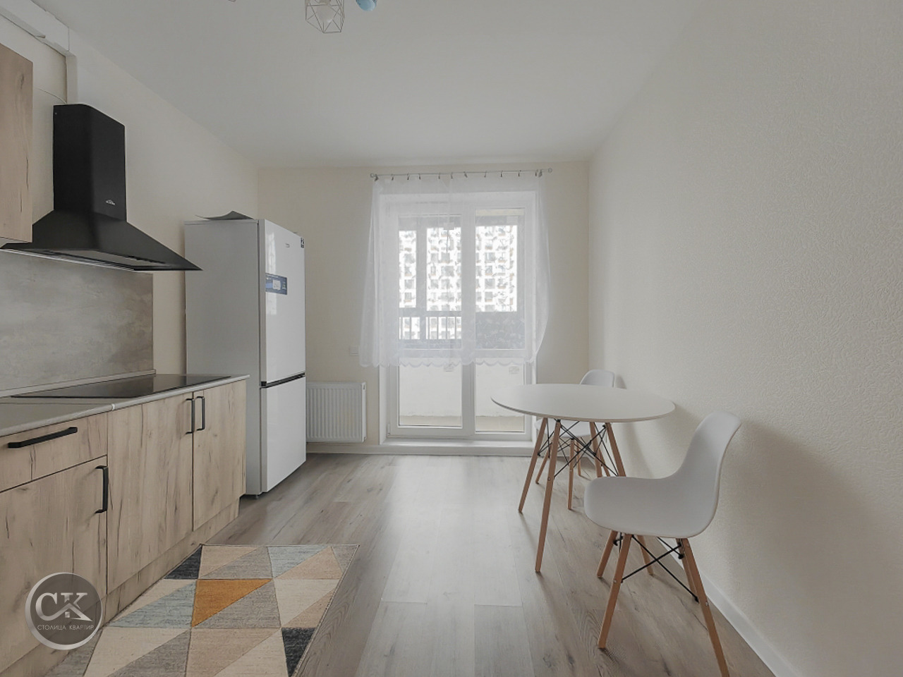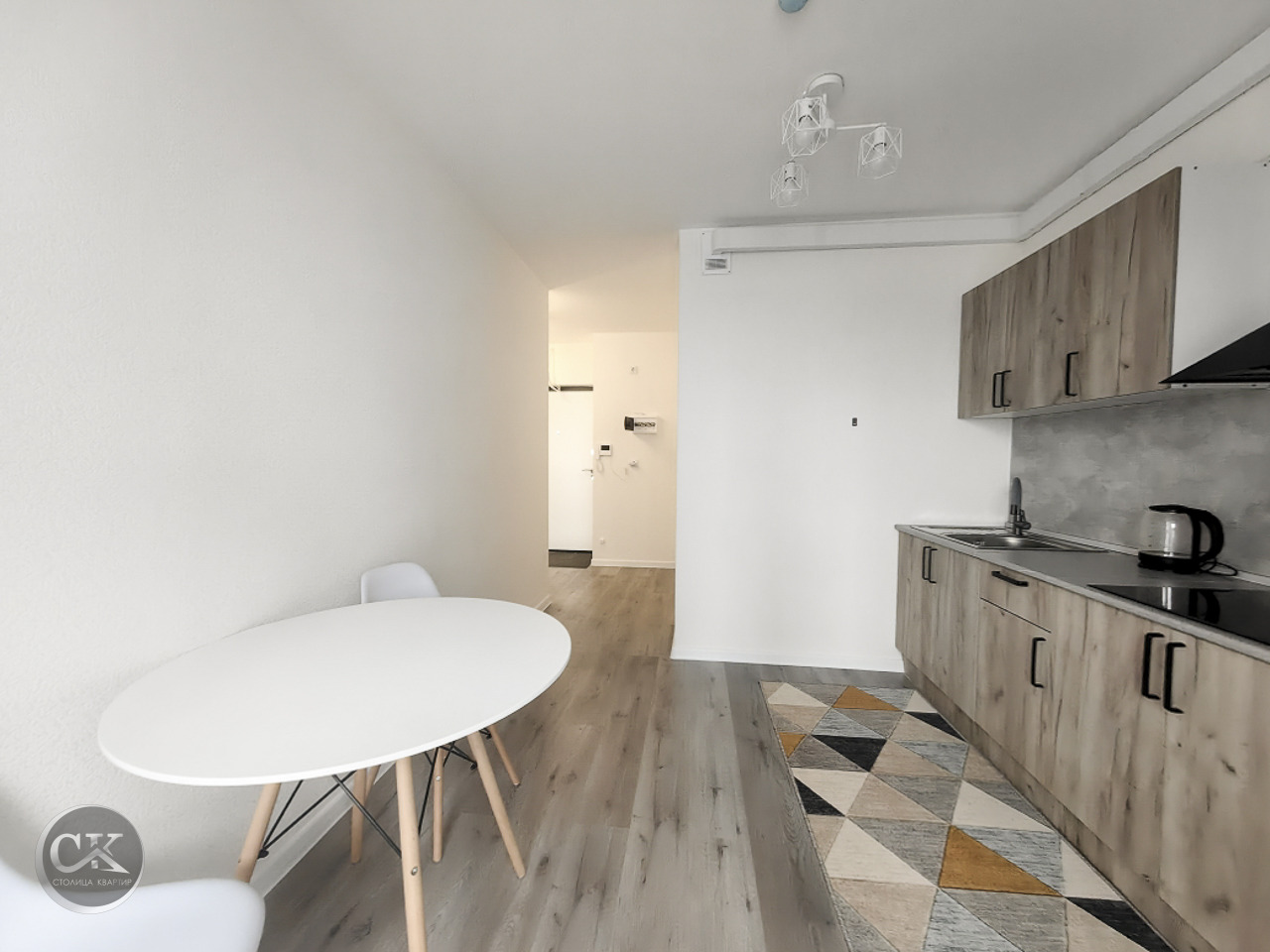 - полностью оборудованная кухня: холодильник, варочная панель, вытяжка, электрический чайник.
