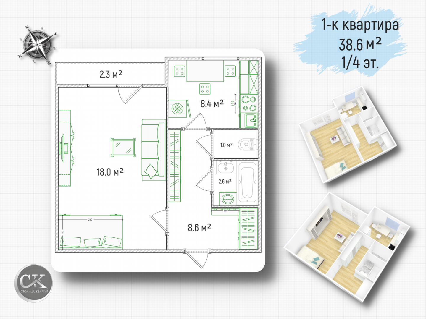 Общая площадь: 38.6 м² | Жилая: 18 м² | Кухня: 8.4 м²